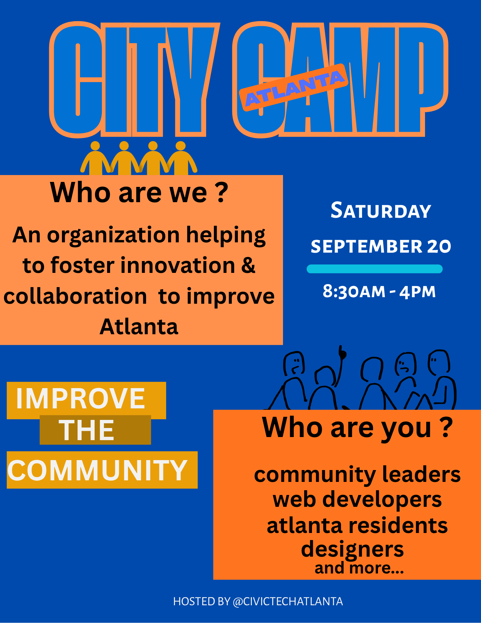 I chose to explain the artifact to bring awareness to city camp hosted by Civic tech with a few basic design principles. I made sure to include a typeface that would be bold yet simple to read to draw viewers to the flyer. I also wanted to use bright and bold colors for the same reason.