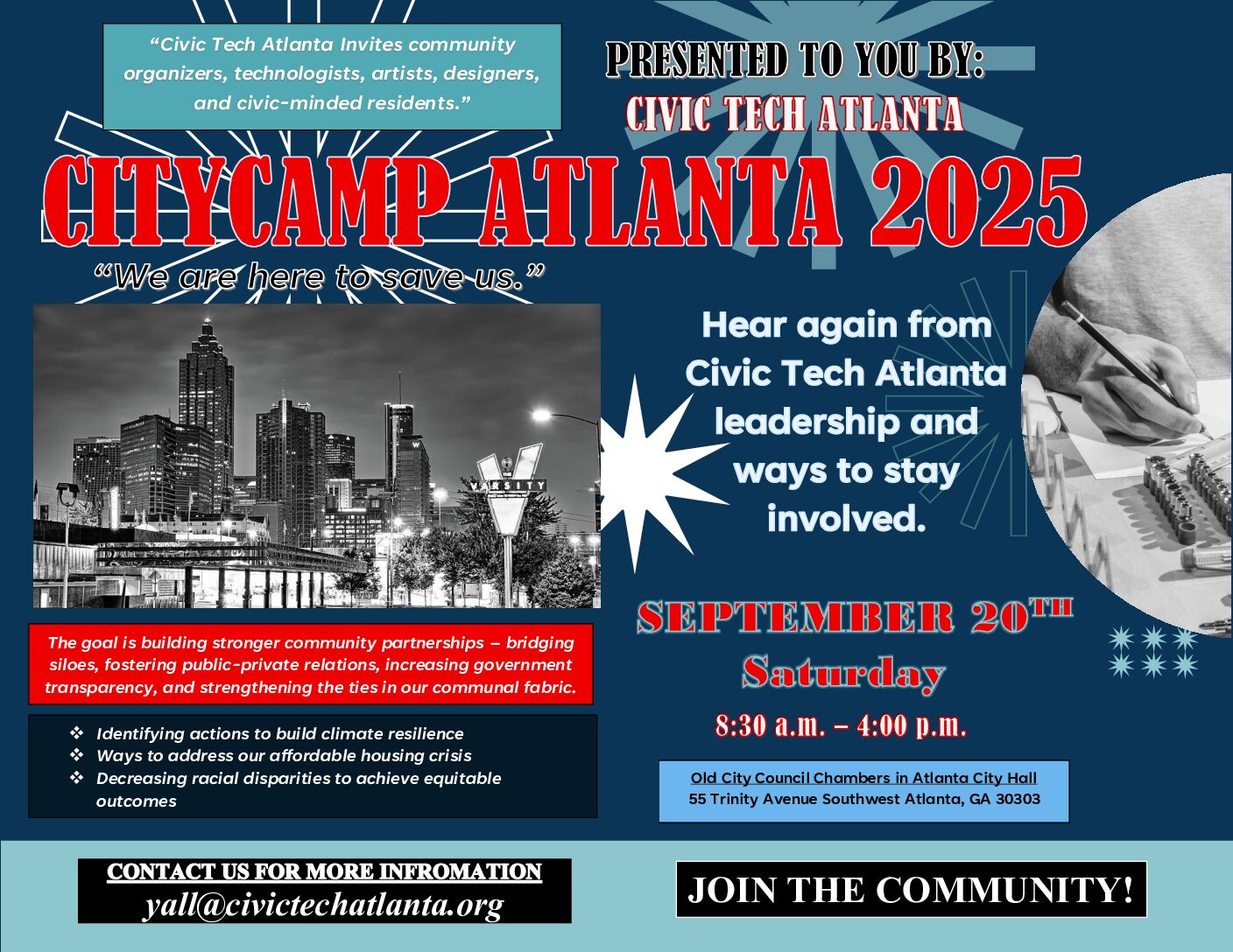 I gathered information about the goals of Civic Tech Atlanta and its CityCamp 2025 event from the Eventbrite. From details about the event itself, such as the date and what participants can expect, but most importantly finding ways to stay involved. The issues that needed to be fix was bringing forward the details and the information towards the audience they wanted to attract. I made sure to include Civic Tech Atlanta’s broader goals, such as and incorporating their mission quote, “We are here to save us.” I decided to use imagery of the Atlanta skyline to connect the flyer to the local community as well. The information I gathered allowed me to create a flyer that not only announces the event but also communicates its deeper purpose of community-driven change.