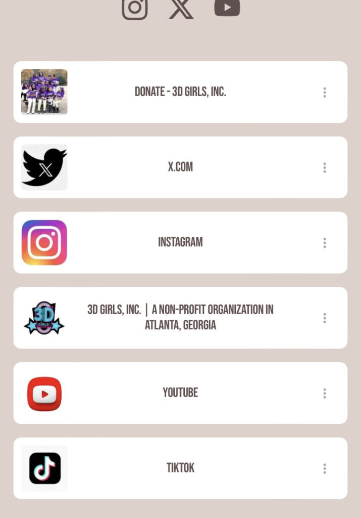 3D Girls Inc. uses its social media platforms to communicate a clear mission centered on empowering young women and girls. The message highlights a commitment to helping youth believe in themselves, dream beyond limitations, and achieve personal and academic success. I decided to highlight the mission statement to be believing, dreaming and achieving. The organization focuses on S.T.E.A.M. mentoring, social-emotional wellness, and support for new and expecting mothers. Through educational programs, parent engagement, and mental-health-oriented services, 3D Girls Inc. positions itself as a community resource dedicated to growth, resilience, and opportunity. I think the online link in the bio should be a link tree to the multiple different outlets they offer and not just donation in their online presence which should emphasizes encouragement, empowerment, and intentional mentorship for girls across Atlanta and surrounding communities. I created a link to combine and focus on the mission of the platforms.