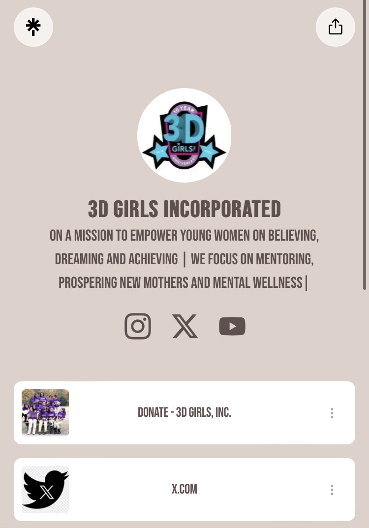 3D Girls Inc. uses its social media platforms to communicate a clear mission centered on empowering young women and girls. The message highlights a commitment to helping youth believe in themselves, dream beyond limitations, and achieve personal and academic success. I decided to highlight the mission statement to be believing, dreaming and achieving. The organization focuses on S.T.E.A.M. mentoring, social-emotional wellness, and support for new and expecting mothers. Through educational programs, parent engagement, and mental-health-oriented services, 3D Girls Inc. positions itself as a community resource dedicated to growth, resilience, and opportunity. I think the online link in the bio should be a link tree to the multiple different outlets they offer and not just donation in their online presence which should emphasizes encouragement, empowerment, and intentional mentorship for girls across Atlanta and surrounding communities. I created a link to combine and focus on the mission of the platforms.