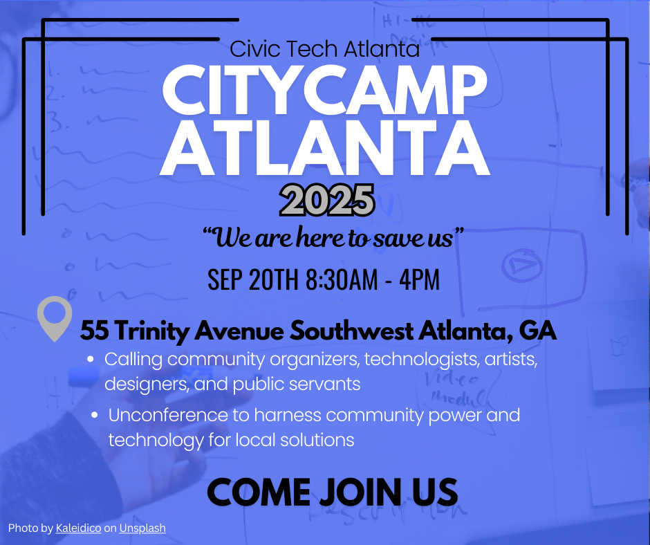This artifact was designed in Canva with the intention of being a social media post. With the sleek, clean imagery, viewers can better digest the important information about CityCampAtlanta, such as the point of the event, date and time, and address. By making the “come join us” text large and bold, it calls for the collection of the community.