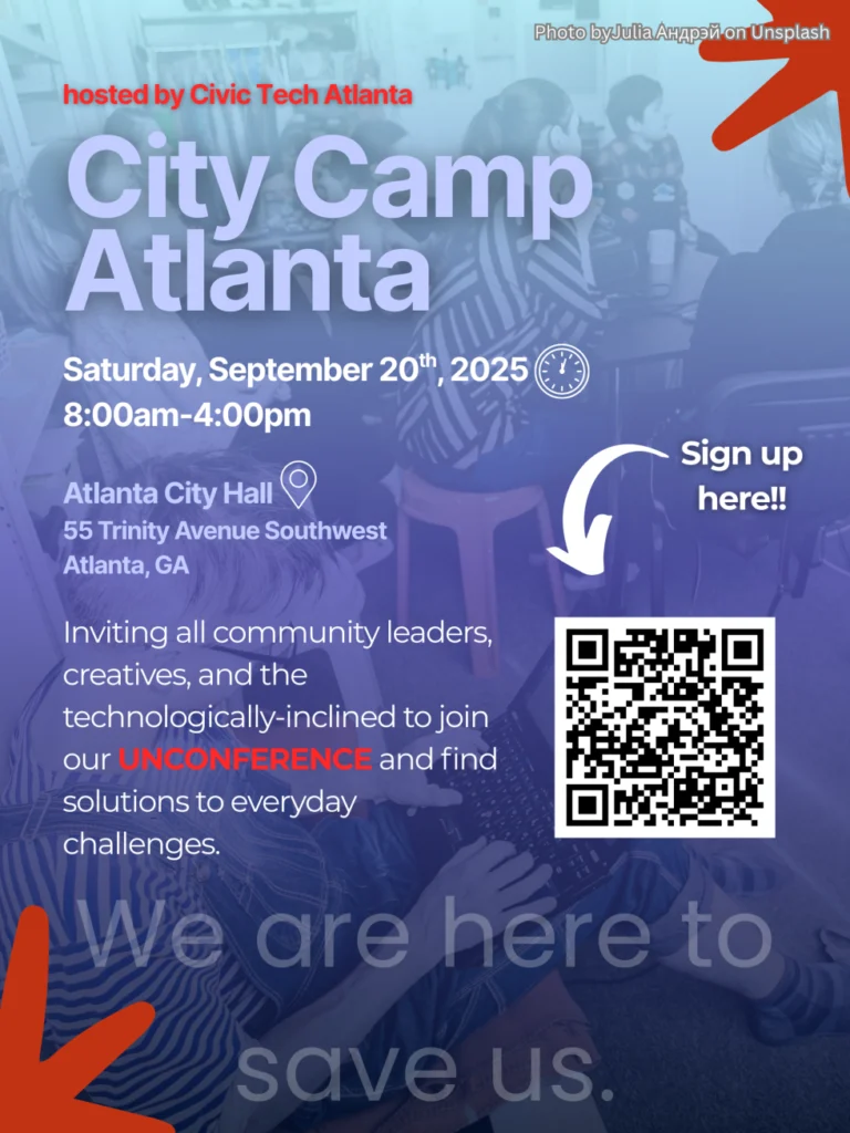 This artifact was designed with Canva. Its purpose is to be used as either a poster that could be printed and placed in convenient locations, or as a social media post for others to share the event. By including a picture of a large group of people gathered together, it emphasizes the sense of unity that the event has. By highlighting the phrase “we are here to save us” and the term “unconference”, it further engages viewers to discover what the event will entail. QR code placement leads to the Sign-Up webpage. Though, adding a QR code for the main CityCampAtlanta pages may have been a better event indicator.