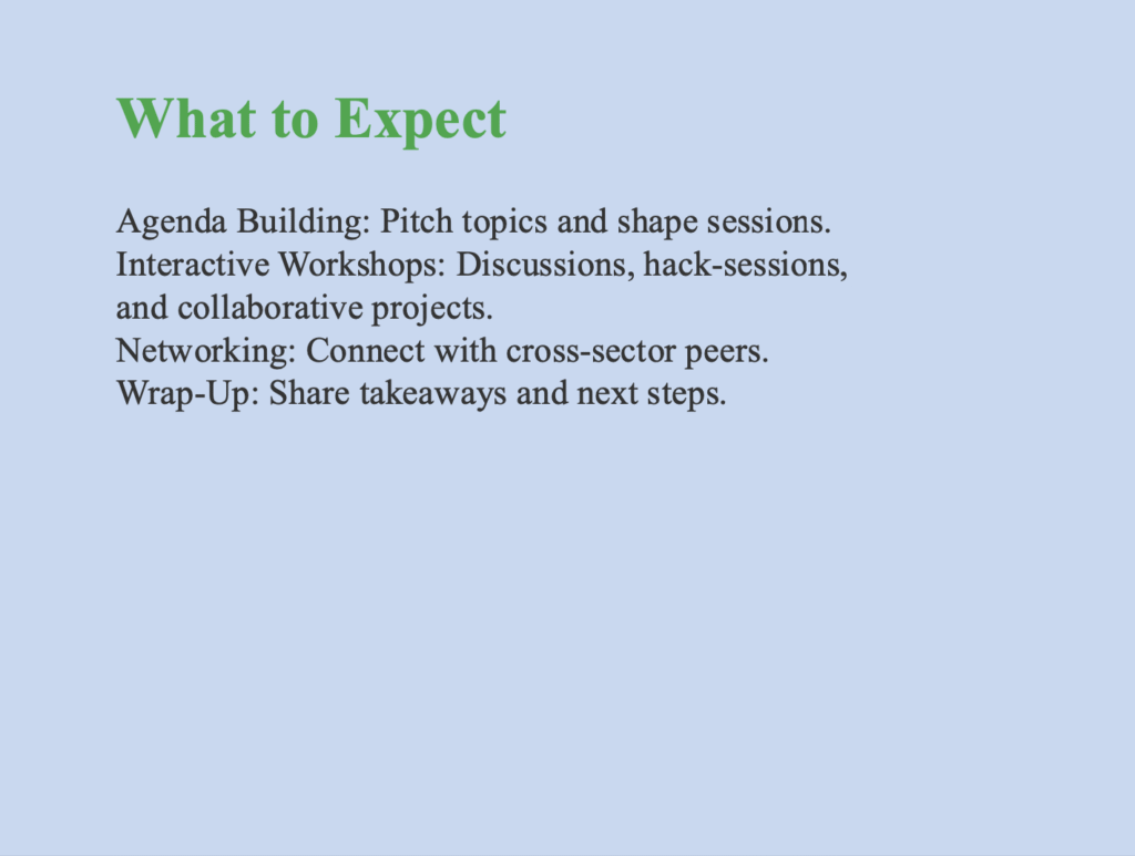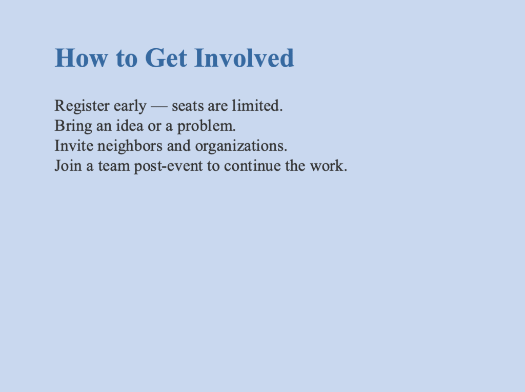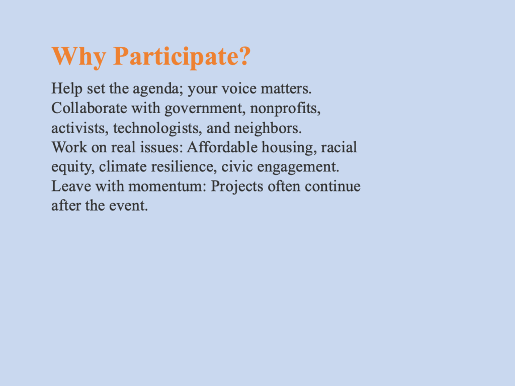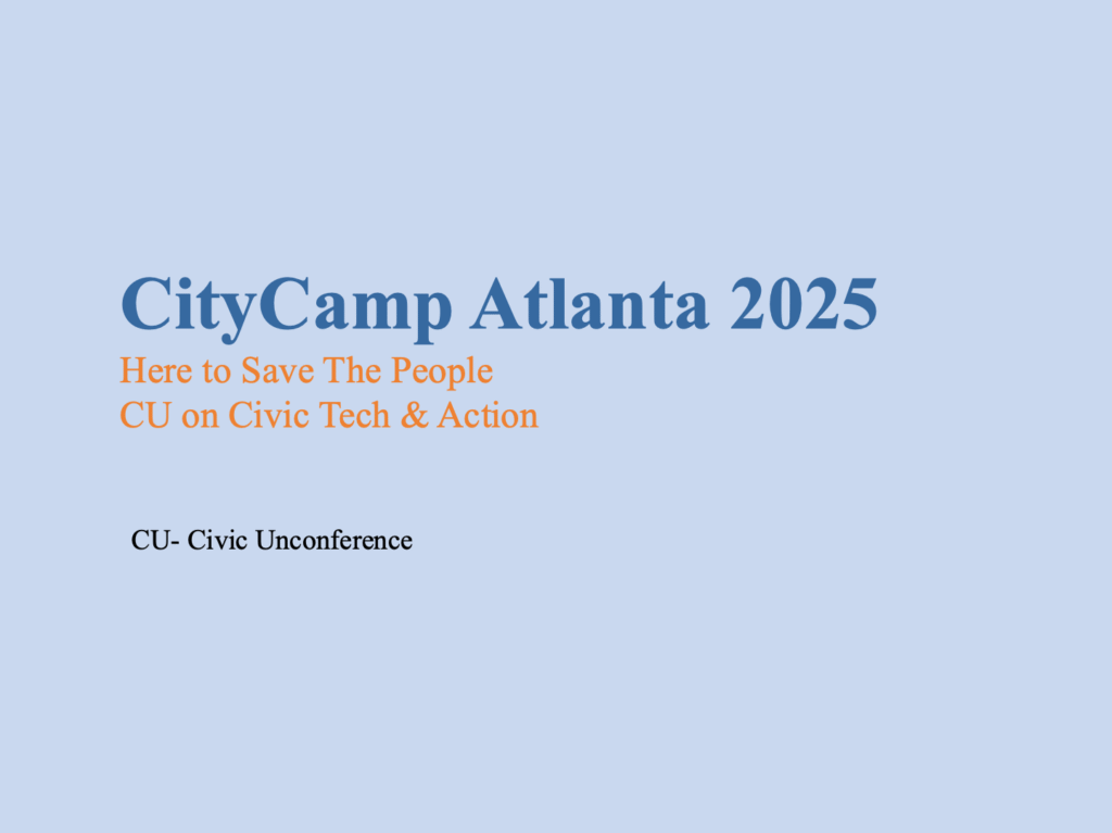 This artifact was put together in PowerPoint with the intention of being used in a social media thread, like Instagram or X(formerly Twitter). A lot more in-depth information about the event is found here, such as what the event is, reasons for viewers of the post to participate, and expectations of CityCampAtlanta. This would be the type of post that would be sent out several months before CityCampAtlanta would occur to get the public more aware of specific details.