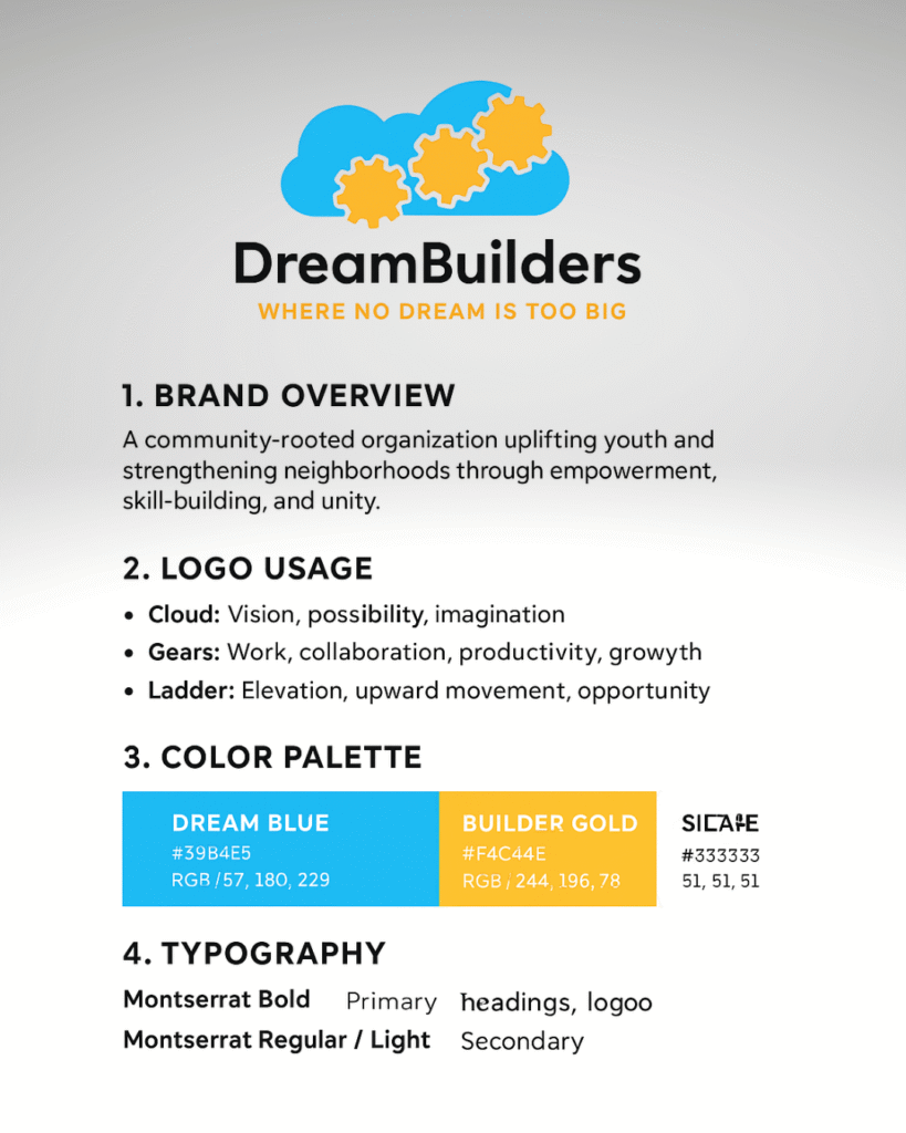 This Artifact consists of a branding guide for Dream Builders. It exists to solve the problem of brand identity and clear online presence for the organization. It gives clear instructions on how to use colors and fonts on future Dream Builders graphics.
